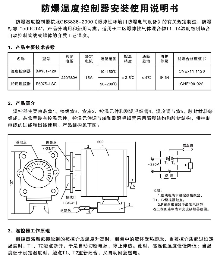 防爆温度控制器(简称温控器)安装使用说明书 一、防爆温度控制器介绍与主要技术参数; 二、防爆温度控制器的工作原理; 三、防爆温度控制器的安装使用与维护说明; 四、防爆温度控制器的电气原理图;
