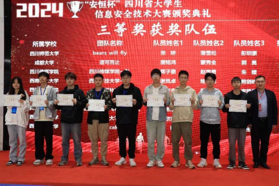 近日,由四川省教育厅主办、中共四川省委网信办和四川省公安厅协办的2024年“安恒杯”四川省大学生信息安全技术大赛在成都信息工程大学双流新型产业学院举行,我院党委副书记侯翔教授指导的“碱基互补配队”斩获三等奖。