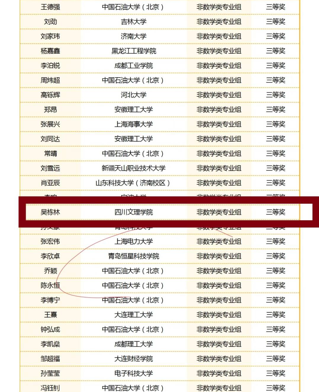 本次华教杯数学竞赛共有来自复旦大学、浙江大学、中国石油大学(北京)、台州科技职业学院等397所高校1052位同学参加决赛,分为[非数学类专业组]、[数学类专业组]、[专科生组]三个组别。吴栋林同学作为非数学类专业组的参赛学生,通过初赛、复赛,最终取得优异的成绩,不仅展现了个人数学知识、修养与努力,也能够激发其他同学的学习积极性,展现我院学子的数学能力和综合素质。