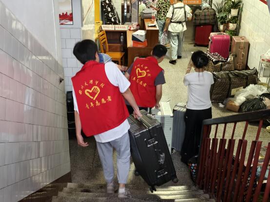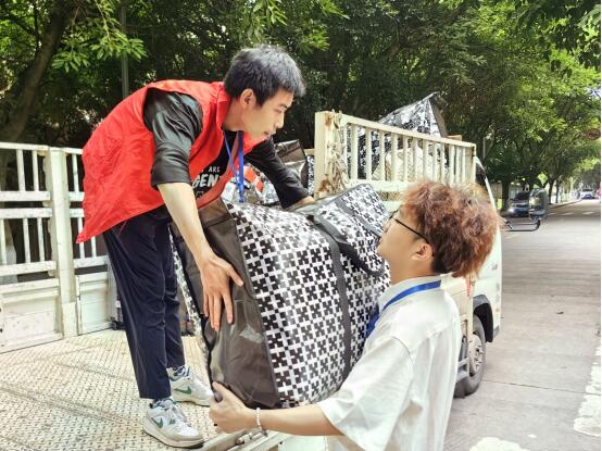 下午,因老区3、4、5号寝室楼暑期改造,我院2022级、2023级学生将行李暂时存放至教学楼。面对繁重的搬迁任务,我院志愿者队伍构建起一套高效流畅的搬迁服务体系,志愿者们分工明确,行动迅速。守在寝室楼的志愿者负责将行李搬下楼放置在小推车里,负责小推车的志愿者将行李运送到相应教学楼下,再由志愿者搬上对应教室,确保每位学生的行李准确归位。
