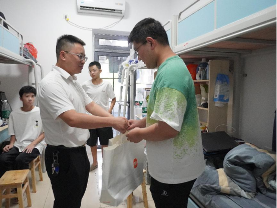当开学典礼恰逢生日之际,学院党委副书记侯翔前往寝室为2024级7班宁俊杰同学送上了温馨的生日祝福与精心准备的礼物。这一举动不仅让宁俊杰同学度过了一个意义非凡的生日,也让在场的每一位同学都深刻感受到了学院的温暖与关怀。他提到,“学院努力为大家营造一个温馨、和谐、积极向上的学习生活环境。无论是学习上的困惑,还是生活中的难题,都请随时向我们倾诉,学院永远是你们最坚强的后盾。”