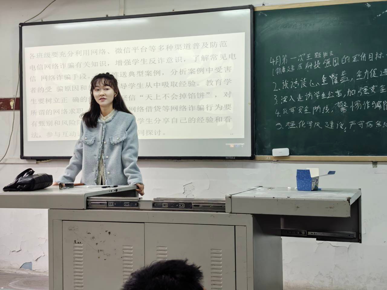 随后,班会聚焦校园安全与风险防范,班长协同辅导员对宿舍卫生安全及电信网络诈骗防范进行细致讲解。在宿舍安全环节,师生共同强调卫生清洁与隐患排查的重要性,详细讲解违规电器识别、安全用电规范及应急处理方法,要求寝室长履行管理责任,密切关注同学晚归情况,如遇异常情况及时上报,学院将严格执行晚归及夜不归宿管理制度,对违规行为依规严肃处理。在反诈教育中,通过剖析网络求职、虚假交易等典型案例,引导学生识别诈骗手段,提升防骗意识,警惕“贪小失大” 心理,增强应对网络风险的辨别能力与自我保护能力。