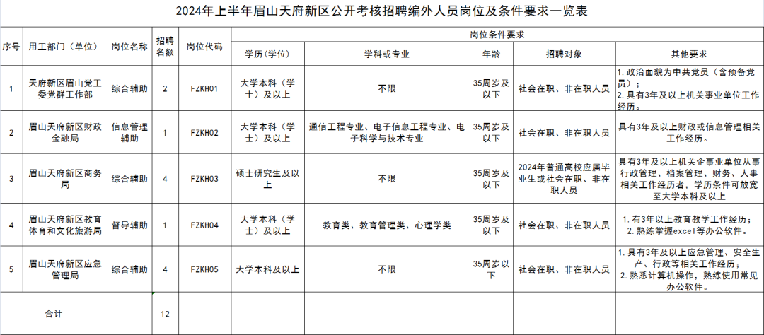 招聘岗位及名额详见《2024年上半年眉山天府新区公开考试招聘编外人员岗位及条件要求一览表》、《2024年上半年眉山天府新区公开考核招聘编外人员岗位及条件要求一览表》(附件1、2)。