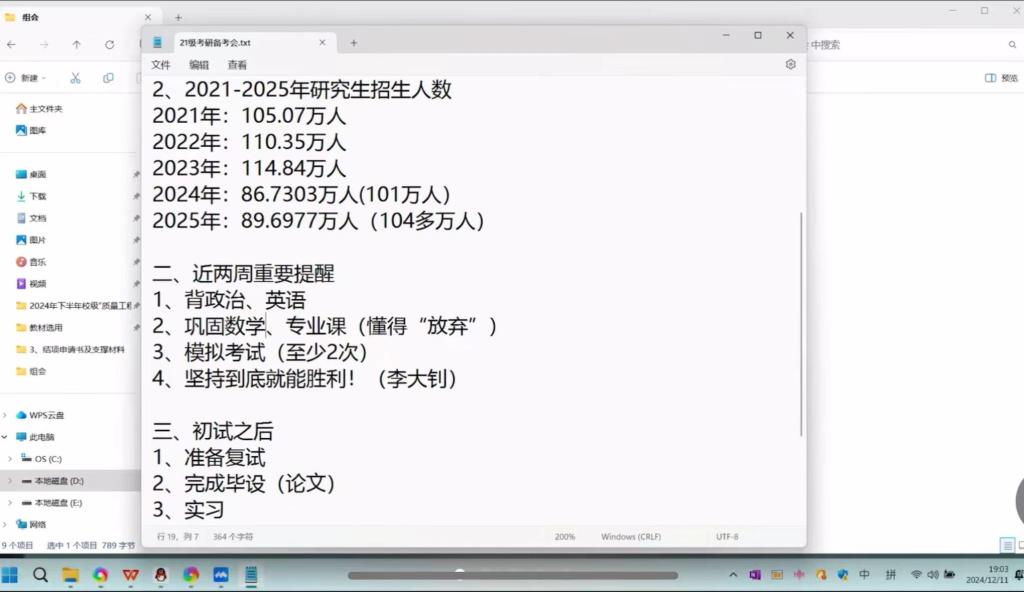 会议伊始,梁弼教授向与会学子详尽介绍了近五年来考研报名及招生情况的总体趋势,通过详实的数据直观展示了考研竞争的激烈程度及各大院校的招生动态。紧接着,梁教授指出数据显示,2025年考研人数预计会比2024年减少50万。这一信息引起了学子们的广泛关注与讨论。梁教授随后解答了同学们的疑问,并提醒大家要理性对待数据变化,保持平稳心态,全力以赴备考。